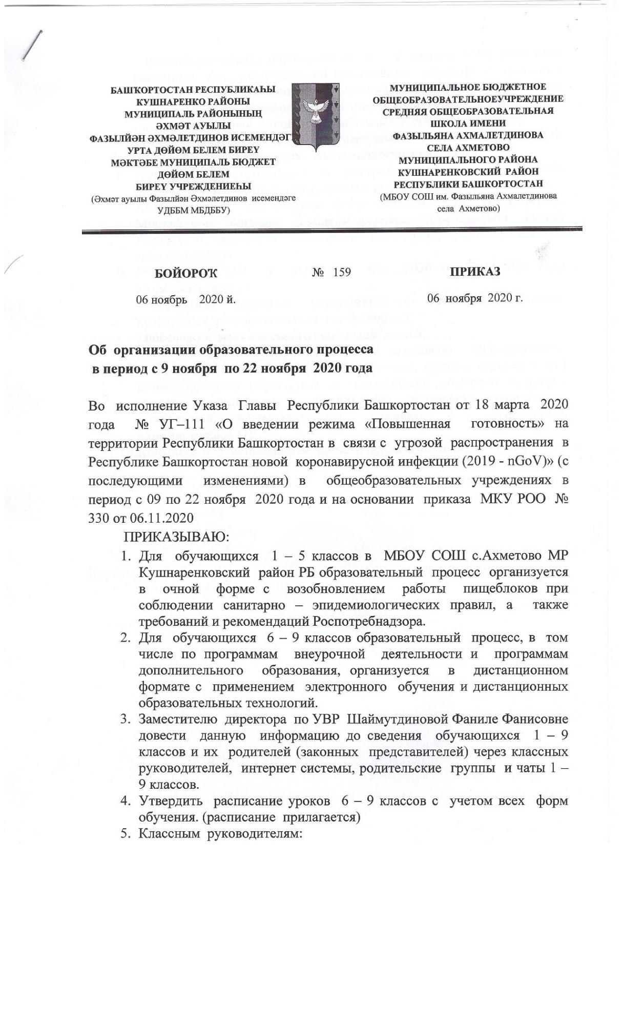 В целях снижения рисков распространения COVID-19 в Республике Башкортостан принято решение продлить дистанционный режим обучения до 22 ноября для учеников 6-10 классов. Сообщаем вам, что в соответствии с изменениями от 2 ноября 2020 года в Указе Главы РБ «О внесении изменений в Указ Главы Республики Башкортостан от 18 марта 2020 года №УГ-111…», а также с приказом МКУ РОО №330 от 6.11.2020 года «О режиме работы общеобразовательных учреждений Кушнаренковского района в период с 9 по 22 ноября 2020 года» наша школа с 9 по 22 ноября 2020 года продолжит работу в следующем режиме: